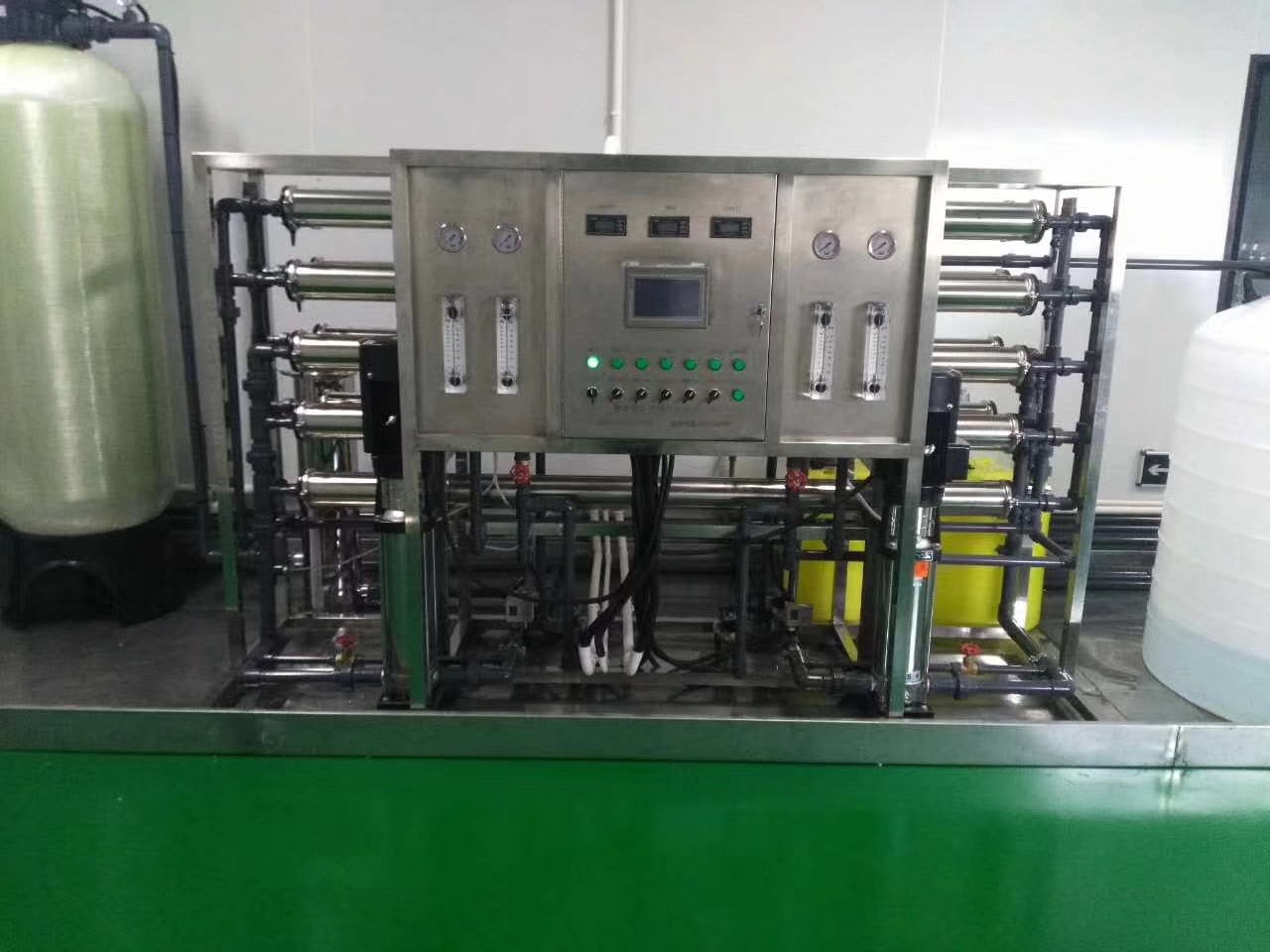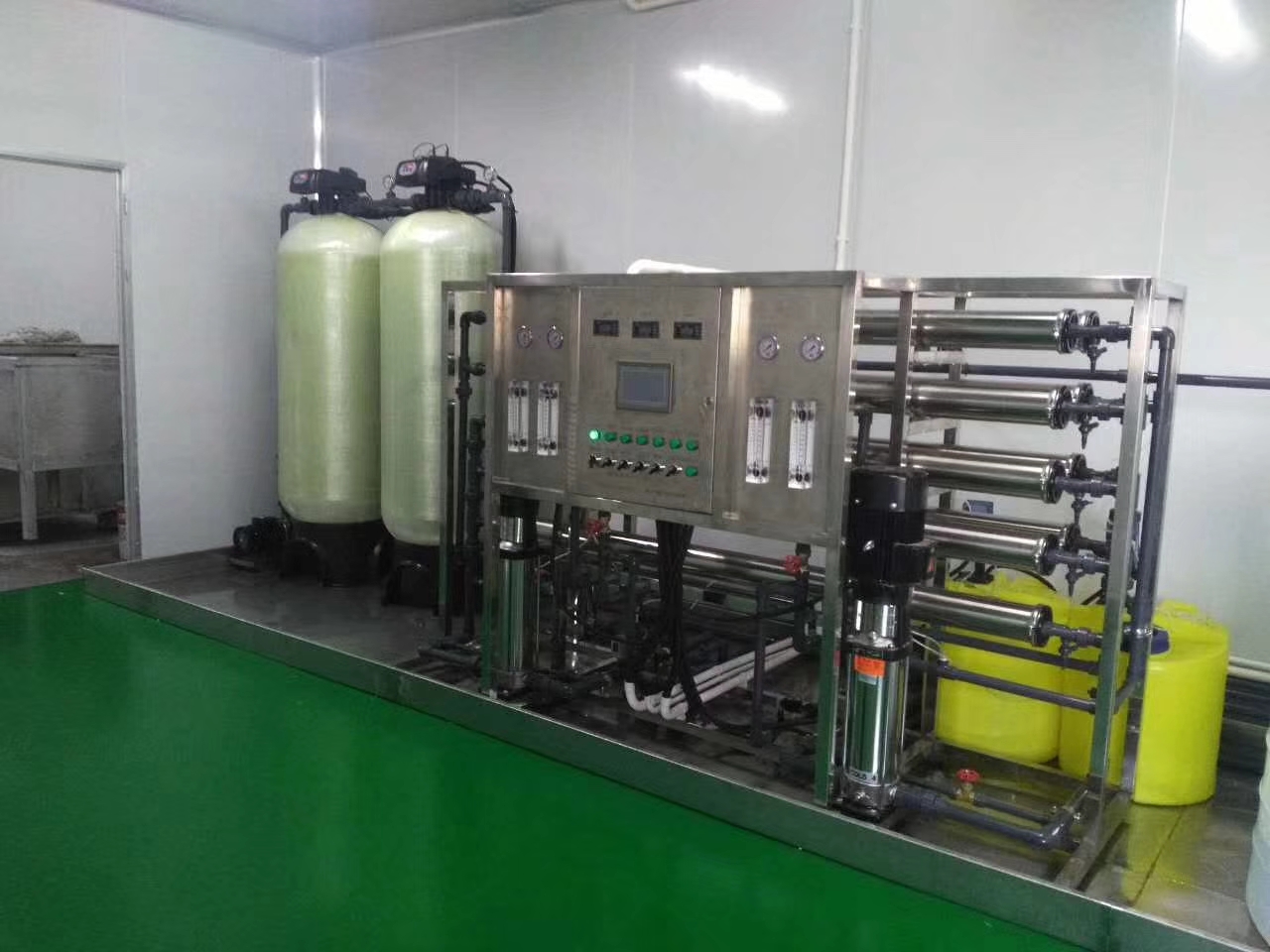 源水箱→源水增壓泵→多介質(zhì)過濾器→活性碳過濾器→陽樹脂軟化器→精密過濾器→一級RO反滲透純水系統(tǒng)→純水水箱→增壓泵→用水點